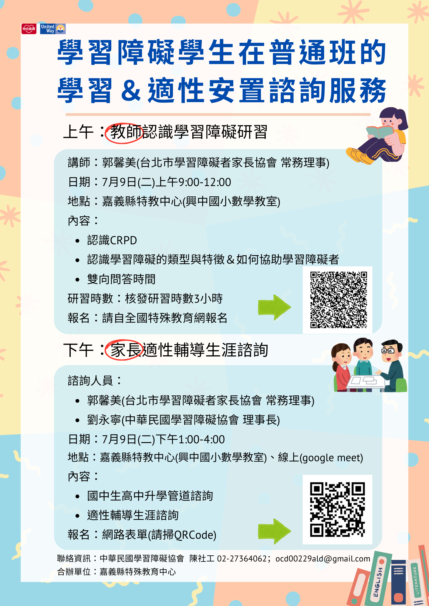 內容:中華民國學習障礙協會於7月9日(二)上午9:00-12:00辦理「教師認識學習障礙研習」,下午1:00-4:00辦理「家長適性輔導生涯諮詢」,地點:嘉義縣特教中心(興中國小數學教室),歡迎大家踴躍報名參加,也請轉發研習訊息給家長,謝謝大家。報名詳細資料,請參閱海報所示。